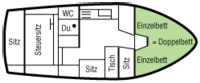 Ausstattung: 1 Kabinenraum, Du/WC, hinten erhöhter Steuerstand mit Plane abdeckbar.